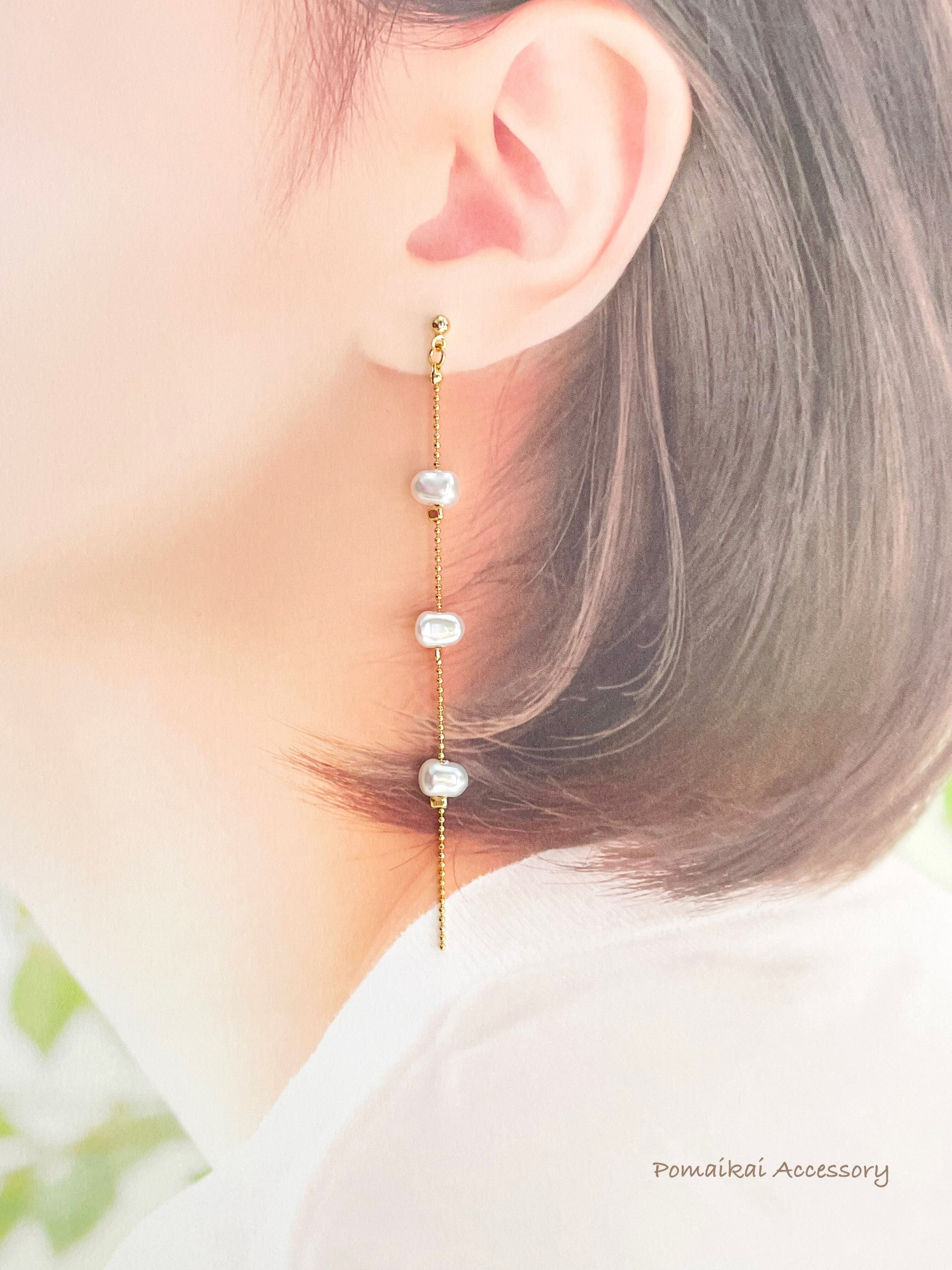 パールボールのやわらかいフォルムが耳元で揺れ、さりげなく女性らしさを引き立てます。ピアスの全長は約8センチで、軽やかなつけ心地です。